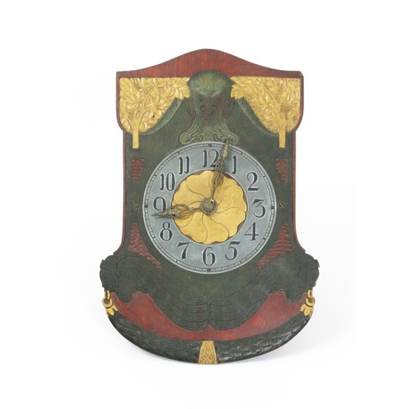 A Continental Secessionist wall clock, probably Dutch or German, the shaped rectangular face carved with central mask flanked by golden trees, circular dial above two stylised figures in profile linked with laurel swag, painted in colours unsigned 38.5cm. high