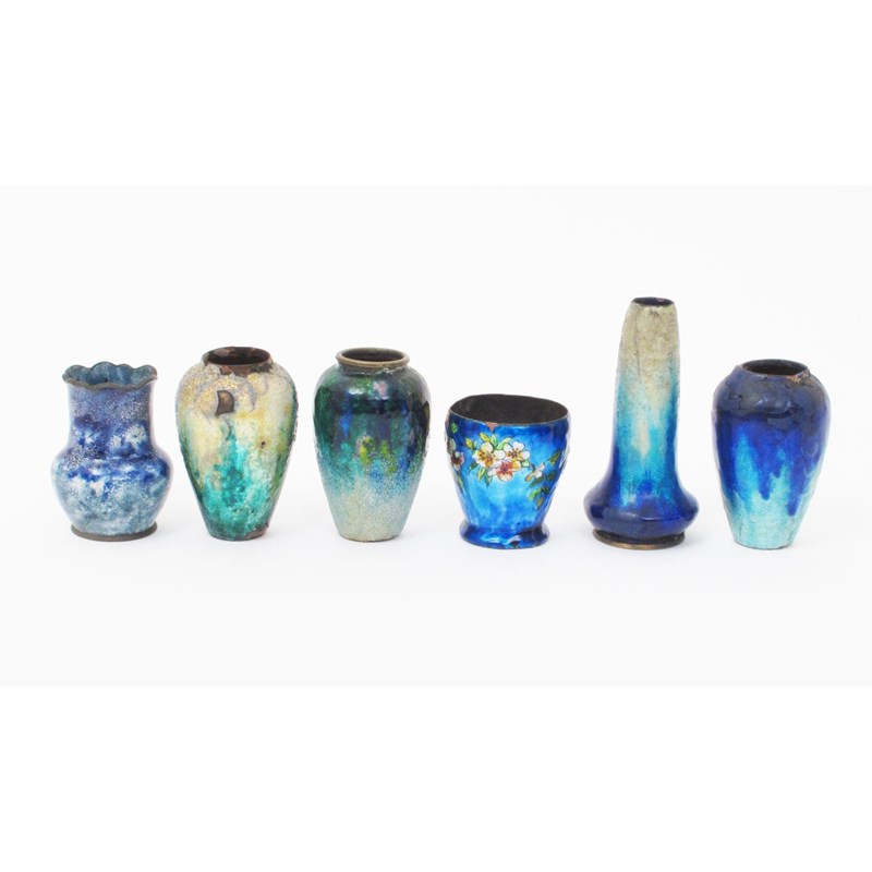 A Limoges enamelled copper vase, painted in enamels with a spray of blossom on a blue ground, a near pair of Limoges enamelled copper vases and three others similar, signed to the foot with indistinct signature and Limoges in gilt, losses 6.5cm. high (6)
