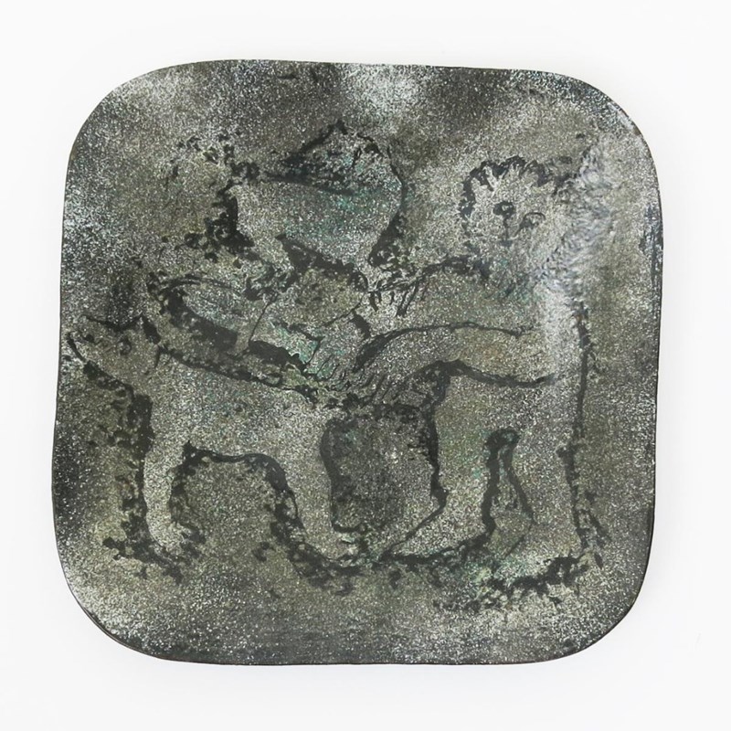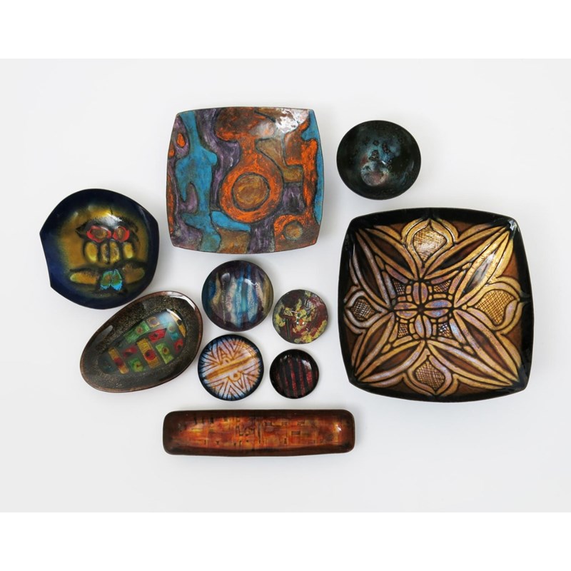 A Duban & Christel Limoges enamel dish, painted with geometric design in orange, blue and purple, and a collection of various enamel dishes, various marks, 23.5cm. wide (10)