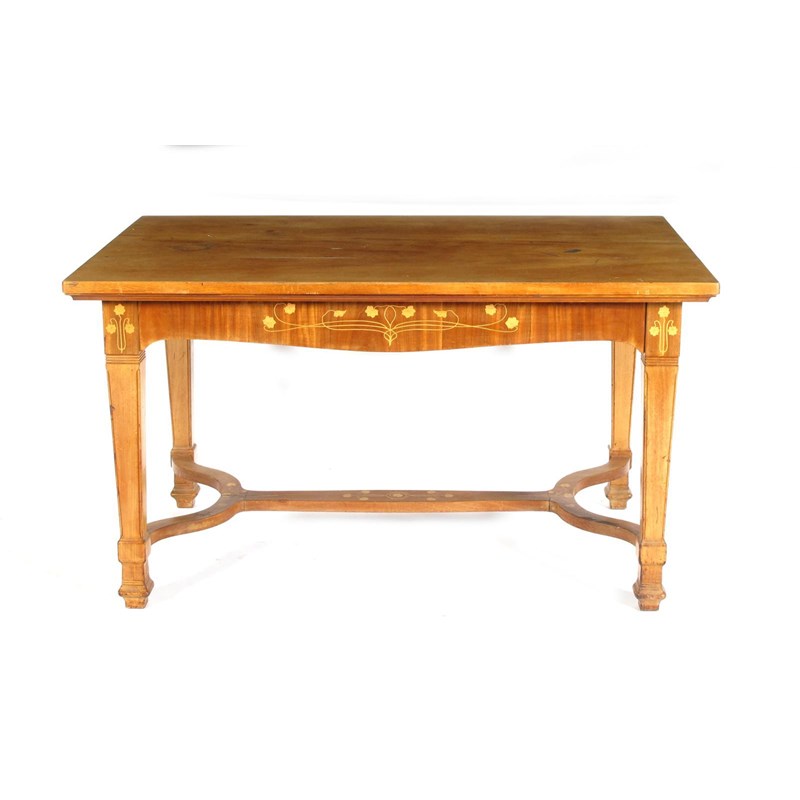 An Art Nouveau inlaid walnut table, probably continental, rectangular top with tapering square legs and shaped stretcher, inlaid with panels of stylised foliage unsigned 130 x 84cm.