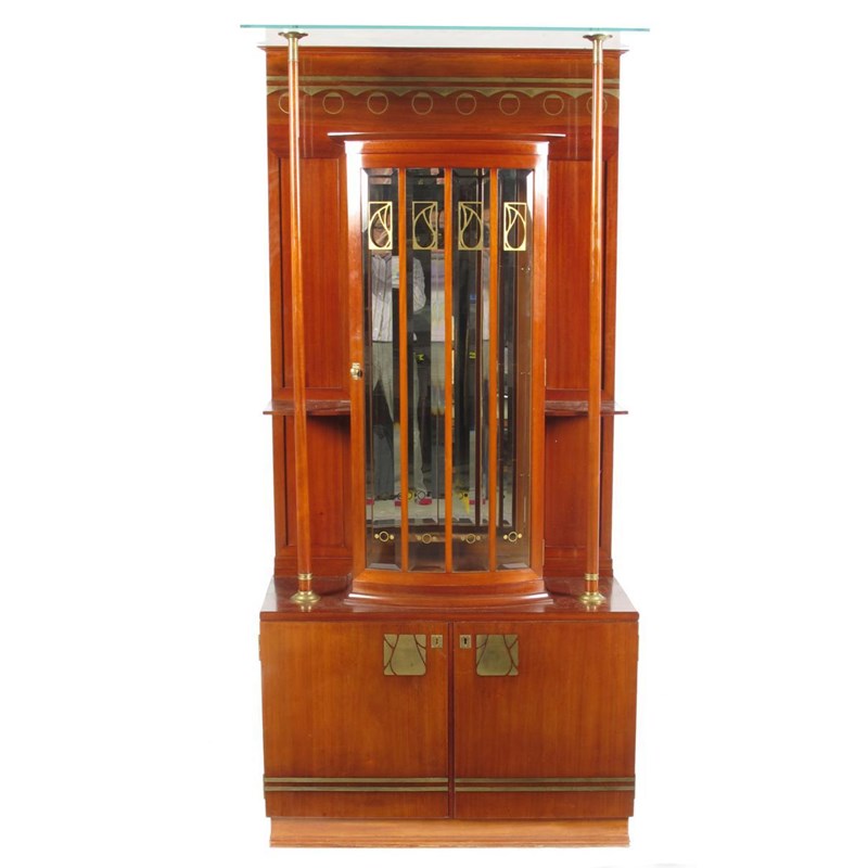 A Darmstadt mahogany and brass inlaid display cabinet, designed by Richard Ludwig, with domed, faceted glass door reverse decorated with secessionist gilt motif, flanked with columns supporting glass mantle, above twin-door cupboard with inlaid decoration applied metal label Richard Ludwig Mobelfabrik 180cm. high, 90cm. wide