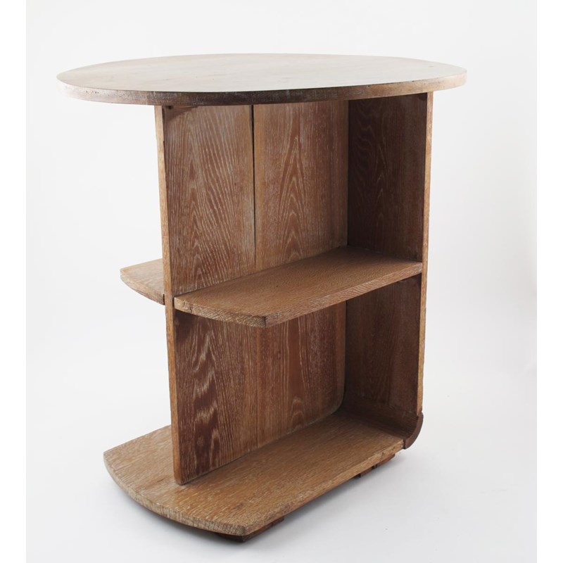 A limed oak occasional table, in the manner of Heal's, circular top over rectangular frame with bookshelf, unsigned 56cm. wide