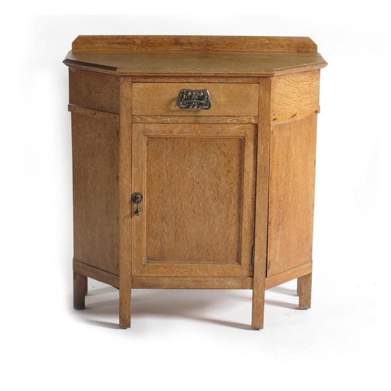 A limed oak cupboard, angled top with central drawer above hinged cupboard door, patinated metal furniture unsigned 18cm. high, 76cm. wide