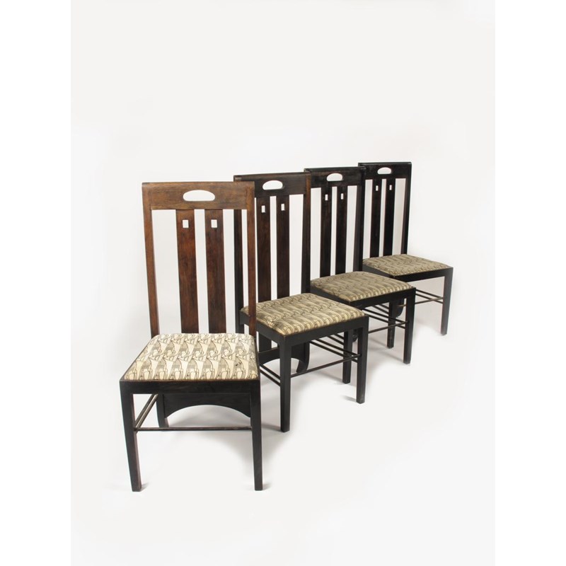 A set of four modern stained oak high-back chairs, originally designed by Charles Rennie Mackintosh, with pierced back splats and sprung loose seat pads, applied metal label 107cm. high