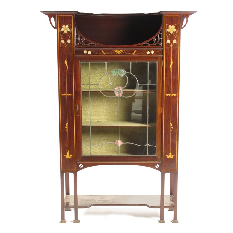 A display cabinet in the manner of Wylie & Lochhead, inlaid with mother of pearl, pewter and box wood flower stems, on six stilt legs, with leaded glass door unsigned 107cm. wide, 190cm high