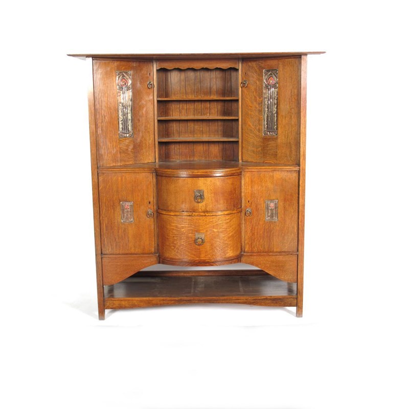 A Wylie & Lochhead oak sideboard, possibly designed by E A Taylor, canted cupboards and open shelves on bow fronted base, the doors set with enamelled metal panels, stamped Design 4765, Work NO,2805-01 152cm. wide, 167cm. high