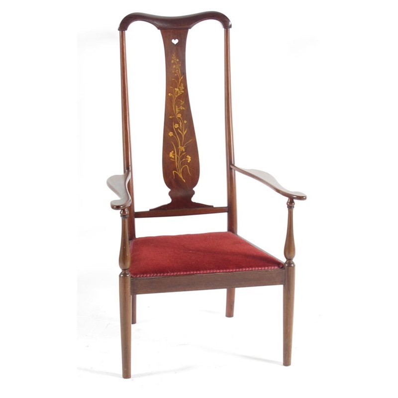 A walnut Brussels chair designed by George Walton, with pierced heart to back and inlaid marquetry flower spray unsigned, reduced legs 109cm. high