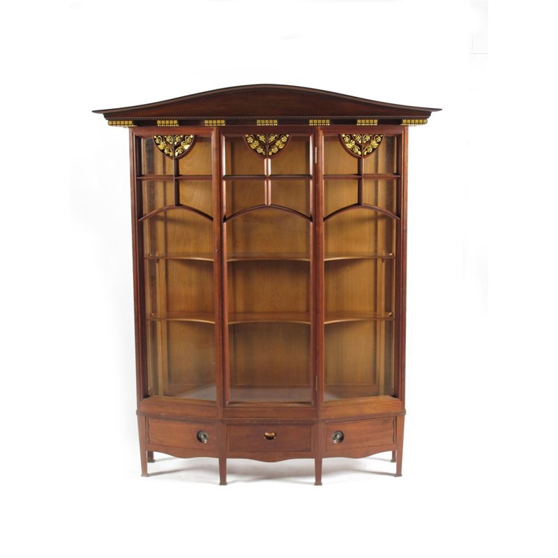A mahogany display cabinet designed by George Walton, over hanging mantle with carved geometric panels, above carved foliate panels decorated with gilt, on six legs, with recessed copper handles unsigned 163cm. wide, 188cm. high