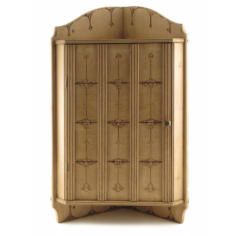 A W.A.S Benson carved pine corner cupboard, designed by W.A.S Benson, the hinged door carved with a foliate column terminating with a pendulous light, incised W.A.S. B. to the inside of the door 82cm. high