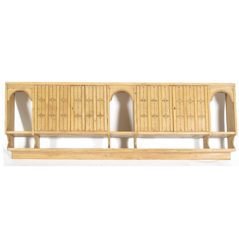 A W.A.S Benson pine carved fitted cupboard and shelf unit, designed by W.A.S Benson, with two twin-door cupboards flanked by three arched open compartments, the doors carved with Art Nouveau foliate columns, above a long shelf carved with leaf detail to the brackets, unsigned 67cm. high, 229cm. wide