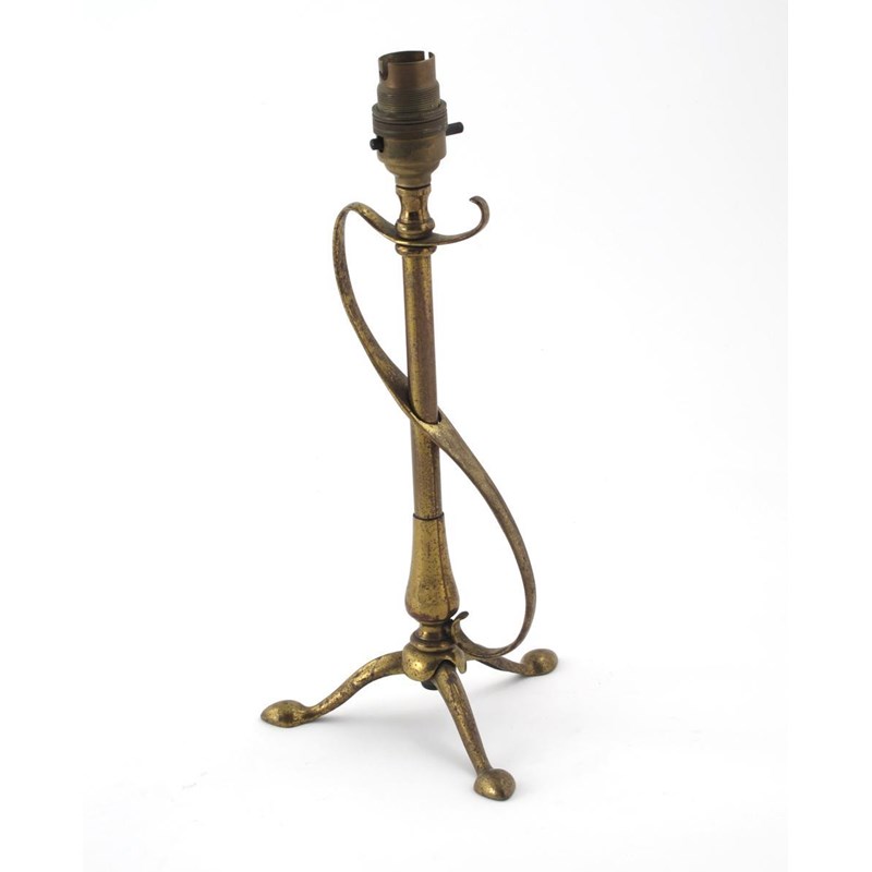 A brass table lamp the design attributed to W.A.S Benson, tripod foot with central tapering stem flanked with scroll unsigned 31cm. high