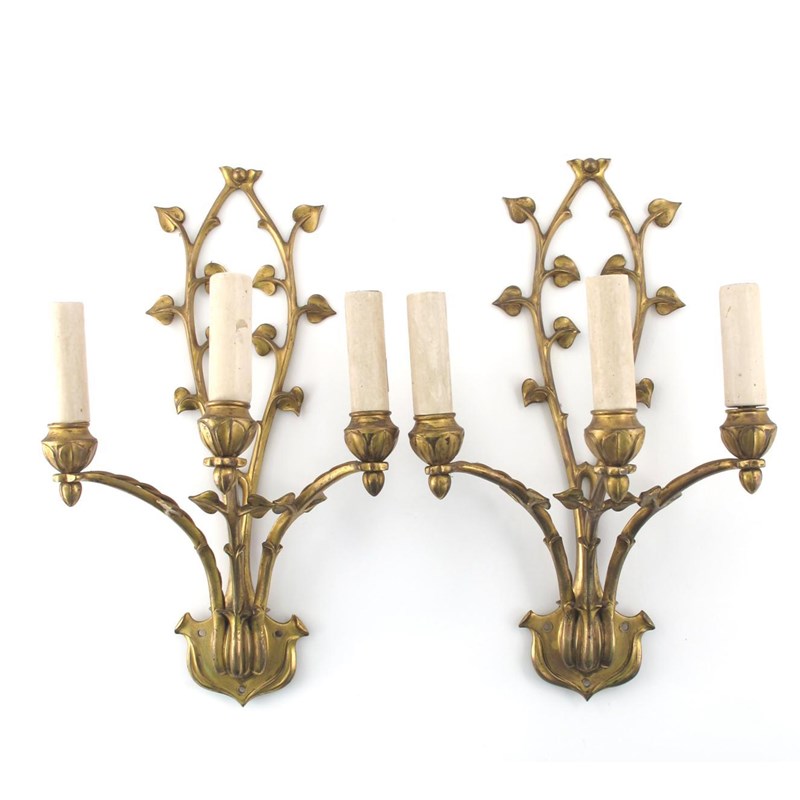 A fine pair of W.A.S Benson gilt metal three-branch wall sconces, the arched stems with cast leaves decoration and flowerbud terminals stamped Benson 42cm. high