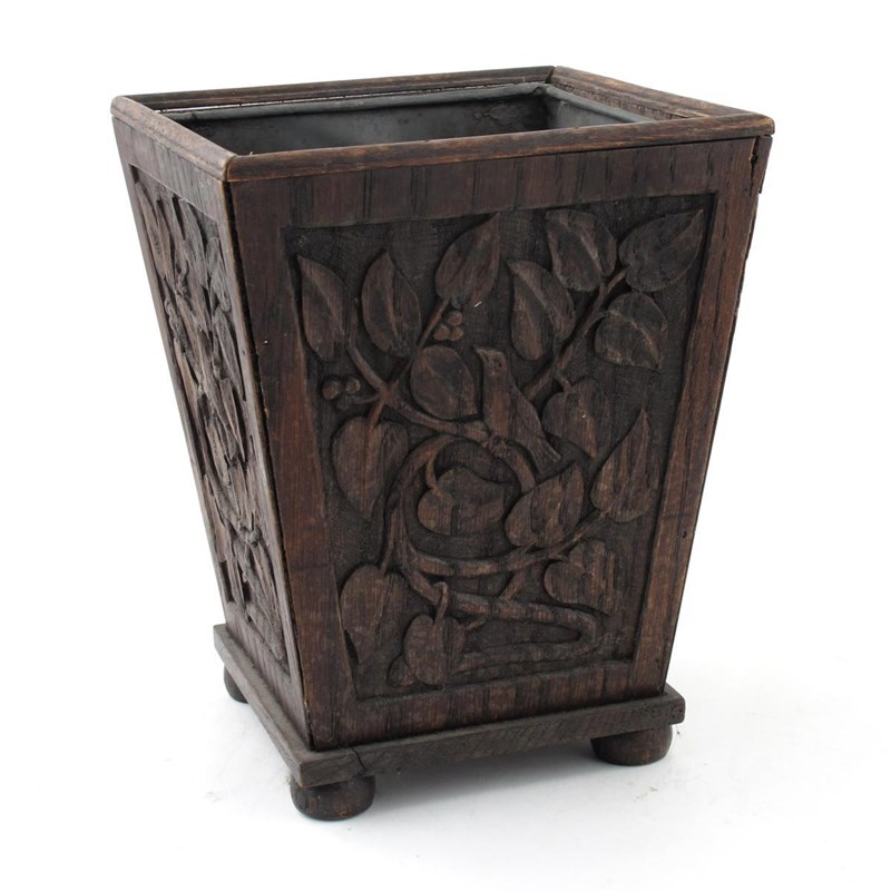 An oak planter with lead liner, tapering square section, each side carved with a bird amongst foliage unsigned 26cm. high