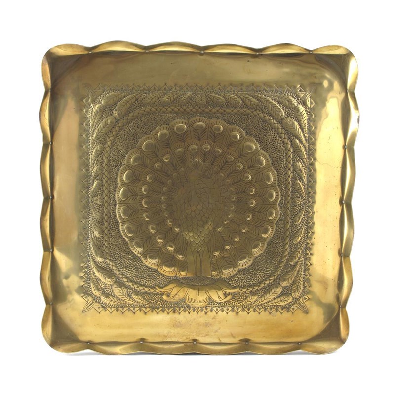 A large brass tray, possibly Fivemiletown, square section with upturned, pinched rim, stamped to the well with a displaying peacock unsigned 59cm. square