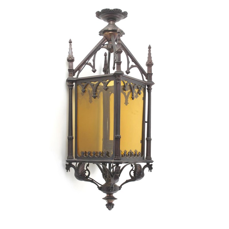 A patinated metal lantern, square section, the base cast with flying griffin creatures, Gothic tracery decoration with amber glass panels unsigned 65cm. high