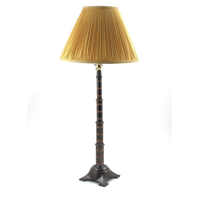 A patinated copper lamp base, cylindrical from on flaring square section base unsigned 55cm. high