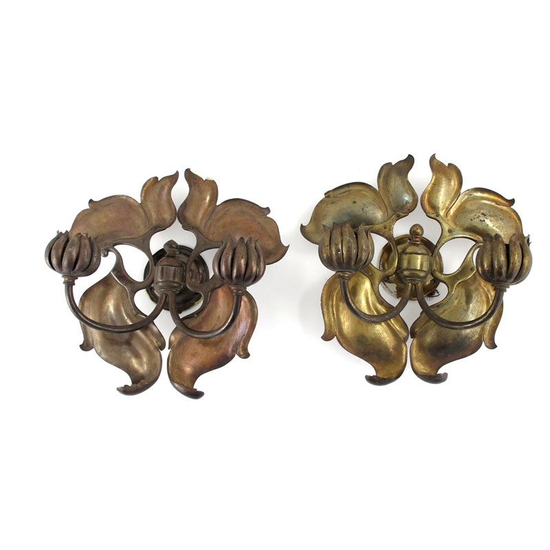 A pair of patinated bronze twin-branch wall lights, floriform, each with patinated copper flower bud sconces and foliate panels unsigned 31cm. high