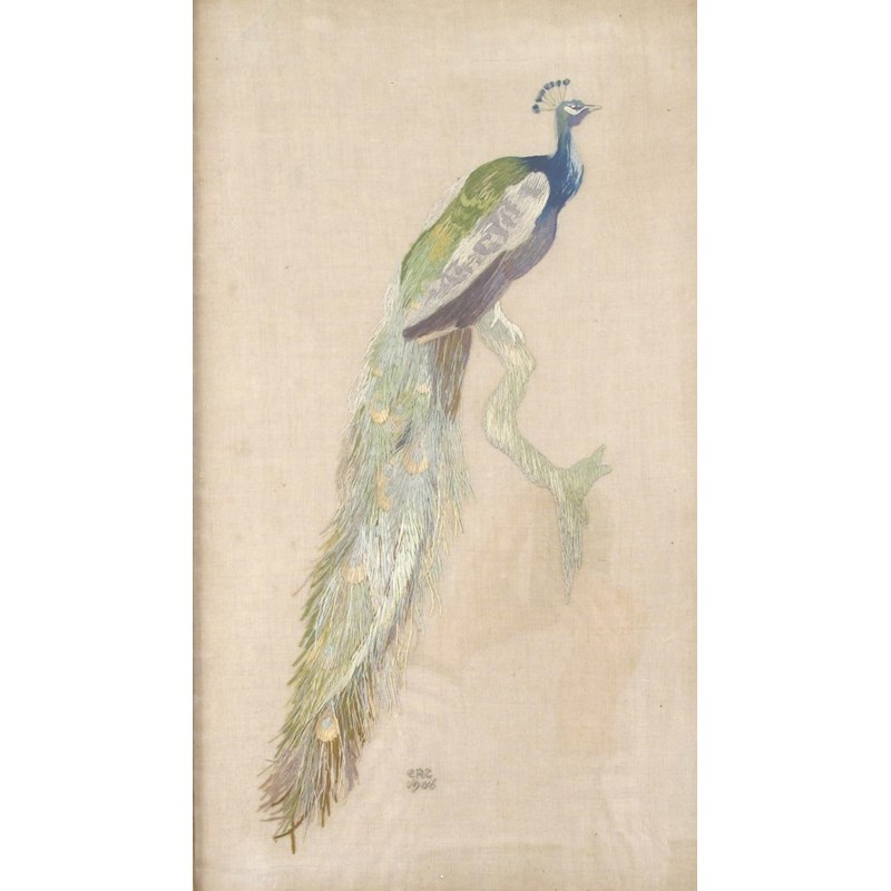 A silk embroidered linen panel of a peacock, the work attributed to Lady Millais, Leacon Hall, Warehorne, signed ERC dated 1906, framed, signed and dated, paper label for Lady Millais to reverse, 45 x 26cm.