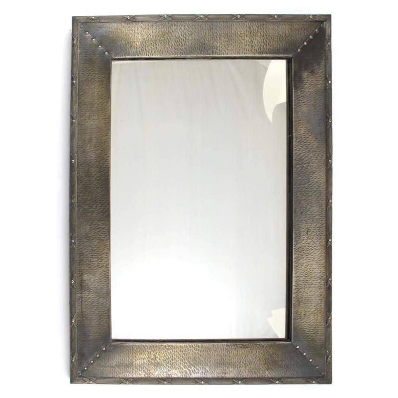 A patinated metal wall mirror, rectangular, hammered finish, with reeded rim unsigned 61 x 46cm