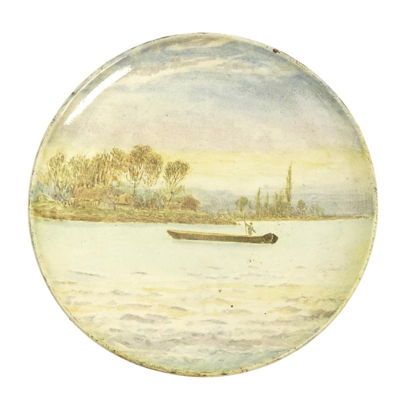 Evening a Doulton Lambeth Faience plate by Esther Lewis, painted with a manned barge in a river landscape, in colours, framed, impressed marks, painted title and E Lewis signature, 16cm. diam.