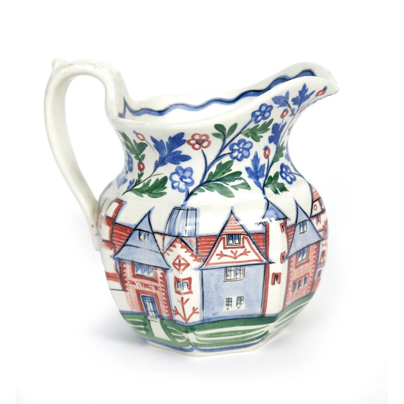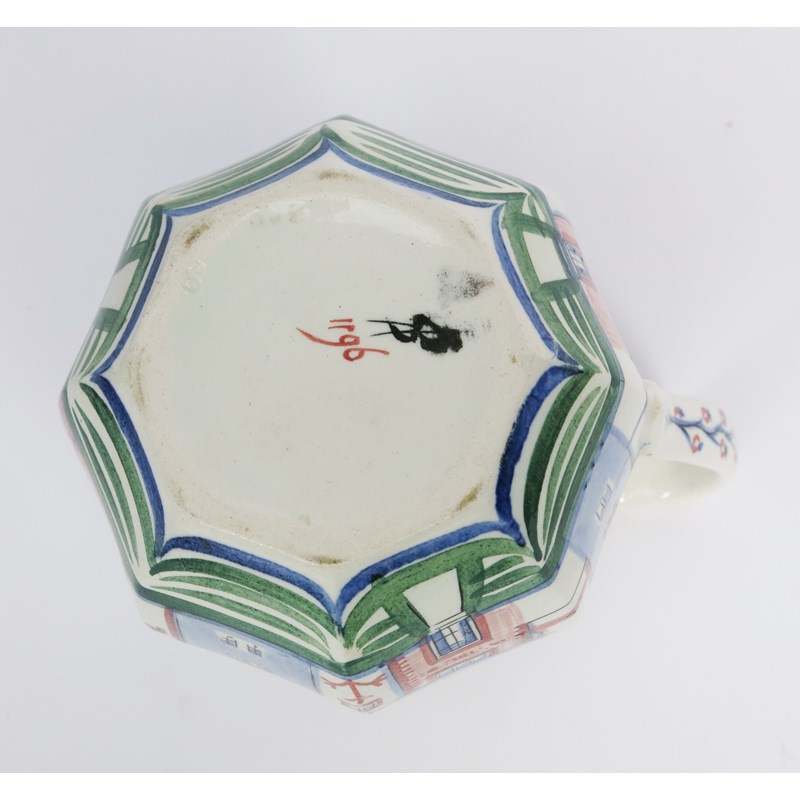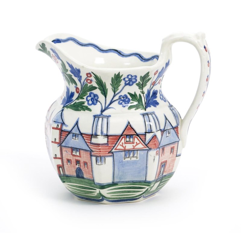 A Wedgwood Pottery jug by Alfred Powell, octagonal form, painted with a frieze of medieval houses, the shoulder and neck painted with flowers and berried foliage, in colours impressed marks, painted monogram, 15cm. high