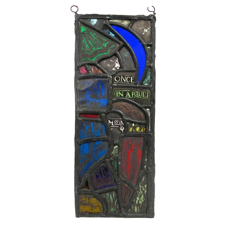 'Once in a Blue Moon' a stained glass panel, rectangular form, decorated with a medieval figure standing below a blue crescent moon, etched inscription, 36 x 13.5cm.