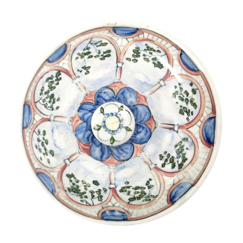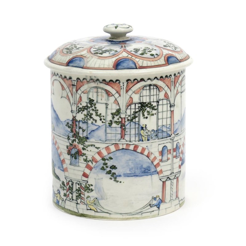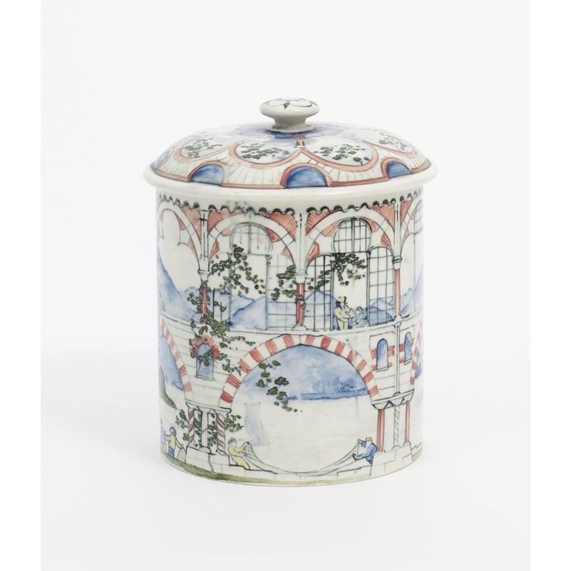 A Wedgwood Pottery jar and cover by Alfred Powell, cylindrical form, painted with oriental fishermen before an arched building, in the distance a mountainous lake landscape, painted in colours, the cover with similar frieze of arches and impressed mark, painted artist cipher, two small chips to inside rim of cover, 14.5cm. high