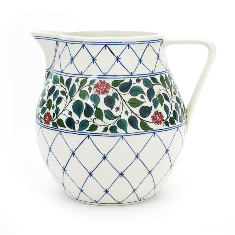 A Wedgwood Pottery jug in the manner of Alfred and Louise Powell, pattern B2319, large, bellied form painted with a band of scrolling flowers and foliage between blue trellis, in green and blue on a white ground, impressed mark, painted pattern mark, small chip to spout, 24cm. high