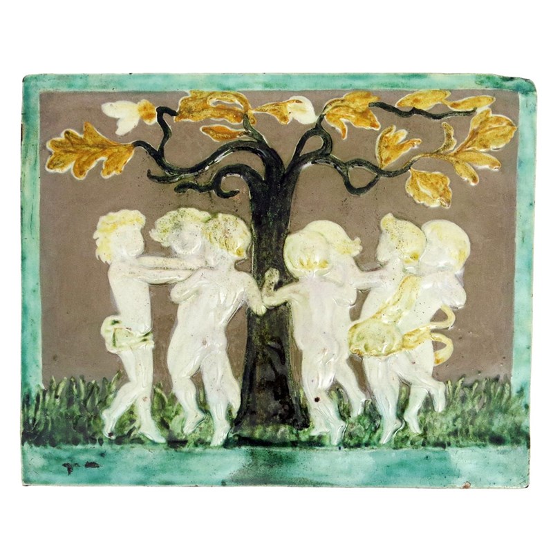 Dancing Panel a Della Robbia Pottery plaque by Liz Wilkins,  after a design by Ellen Mary Rope, dated 1898,  rectangular, cast in low relief with young children dancing around a tree, in shades of yellow, green and turquoise on a white ground, incised factory marks, date and various artist monograms including EMN and painted LW, 24.5 x 20.5cm.