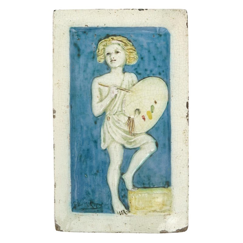 A Della Robbia Pottery wall plaque by Ellen Mary Rope, modelled in low relief with a young artist holding a paint brush and palette, glazed in shades of blue, yellow and green on a white ground, signed EMRope lower left, unmarked to back, chips, 21 x 12cm.