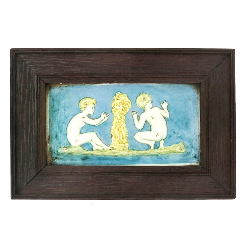 A Della Robbia Pottery plaque possibly by Ellen Mary Rope, rectangular, cast in low relief with two naked young boys beside a campfire, glazed blue, turquoise and yellow on a white ground, framed, indistinct signature lower left, incised M 944 to back, paper price label, 24 x 13cm.