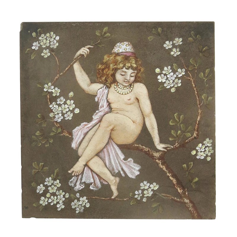 A large Aesthetic Movement tile probably designed by William Stephen Coleman, painted with a young girl seated in a blossoming tree bough, in colours on a matt brown ground unsigned, minor chips to corners, 23cm. square