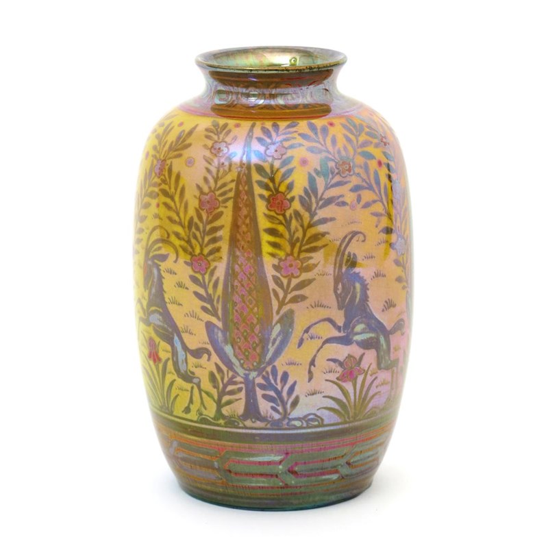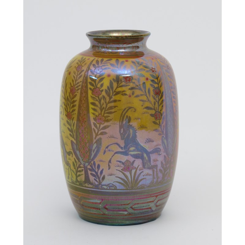 A Pilkington's Lancastrian vase by Richard Joyce, dated 1912, shouldered cylindrical form, painted with a frieze of rearing antelopes and tall pencil cypress trees on a ground of flowers in gold and ruby lustre on a yellow-orange lustre ground, impressed factory marks, painted artist cipher and date mark, 20cm. high