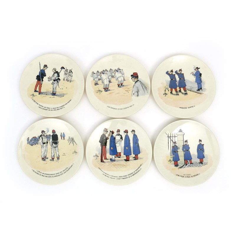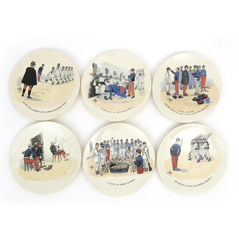 A set of twelve Sarreguemines Mon Regiment plates after designs by Albert Guillaume, printed and coloured with scenes of French soldiers, each titled, printed factory mark, facsimile signature in the print, 22cm. diam. (12)