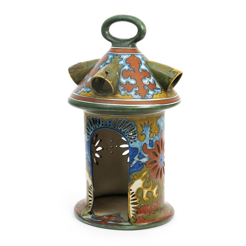 A large Gouda Pottery lantern, pierced cylindrical top with conical top and loop, painted with flowers and foliage in shades of red, blue ochre and yellow on a white ground, indistinct painted mark to base, repair to two vents, 47cm. high