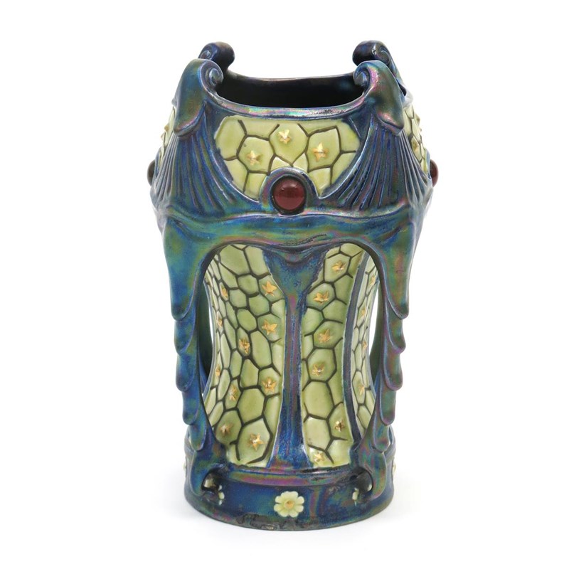 An Art Nouveau pottery vase the design attributed to Zsolnay Pecs, waisted cylindrical body with swollen bowl and four fluted buttresses with claw terminals, modelled in low relief with textured honeycomb glazed in colours and petrol blue lustre, highlighted in gilt, the swollen neck applied with ruby glass roundels, unmarked, 21.5cm. high