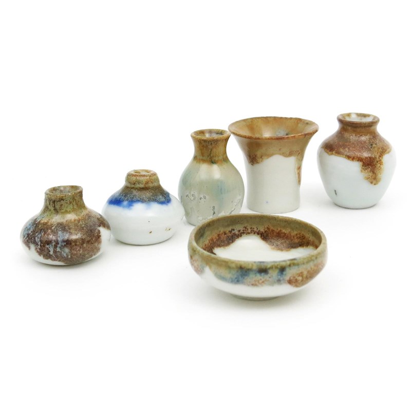 A Delaherche miniature vase, covered to the shoulder with a mottled brown and blue glaze, four other Delaherche miniature vases and a bowl, painted marks, 3cm. high (tallest), (6)