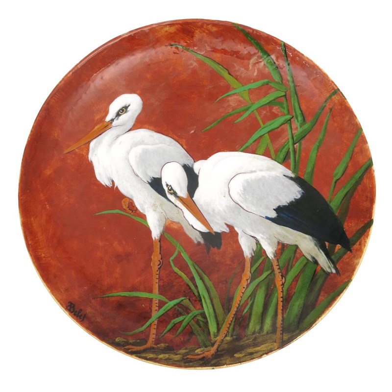 A Vallauris Sevres pottery charger, painted with two storks resting before grasses, glazed in colours impressed mark, signed Vallauris Sevres, indistinct artist signature Bepel, 40cm. diam.