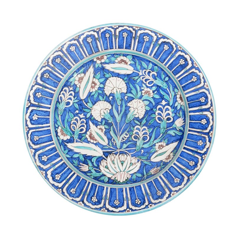 A large continental pottery Iznik charger, painted with carnation flowers in a Persian palette of blue, turquoise and aubergine on a white ground unmarked, 51cm. diam.