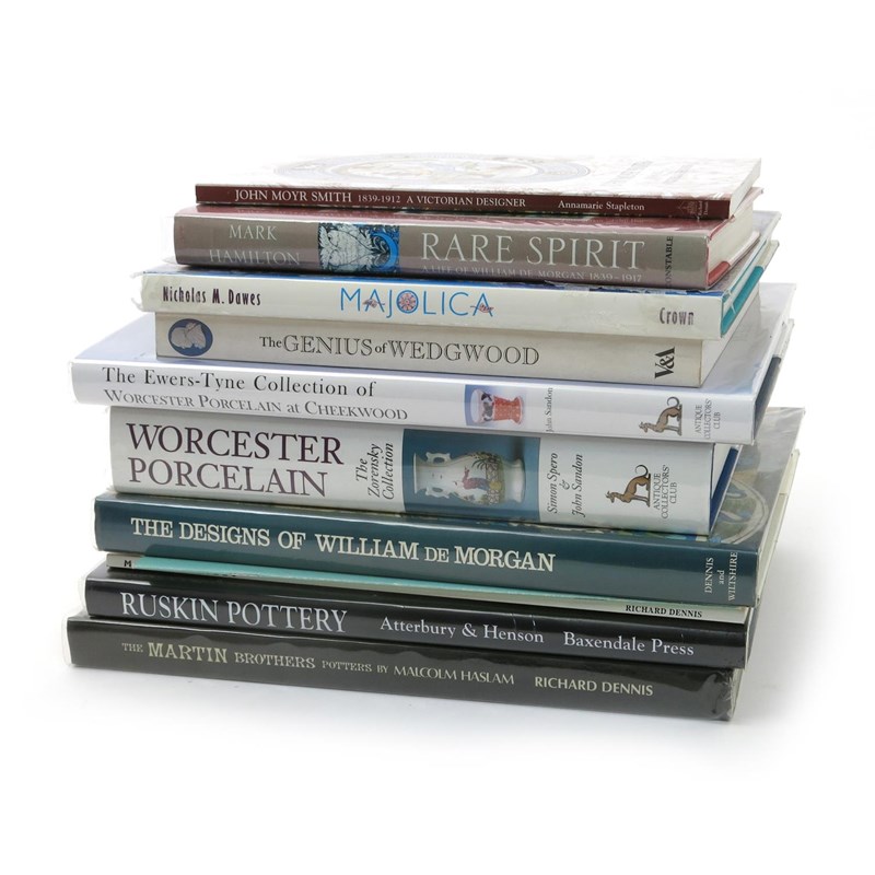 A collection of ceramics and design reference books, including books on Ruskin Pottery, The Martin Brothers, William De Morgan, Worcester Porcelain, New Hall, tiles, Wedgwood and Ceramic Design, (a lot)