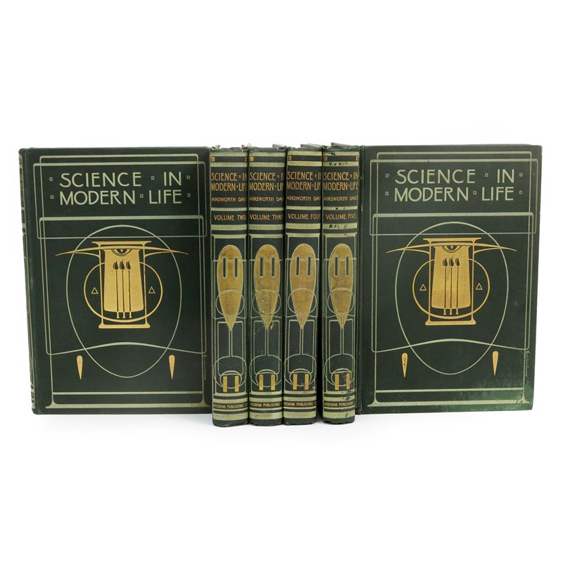Science in Modern Life volumes 1-6 with covers designed by Talwin Morris, published by Gresham Publishing Company, 1909, and Roxborough Series fourteen volumes with covers designed by Talwin Morris, (20)
