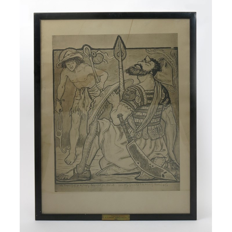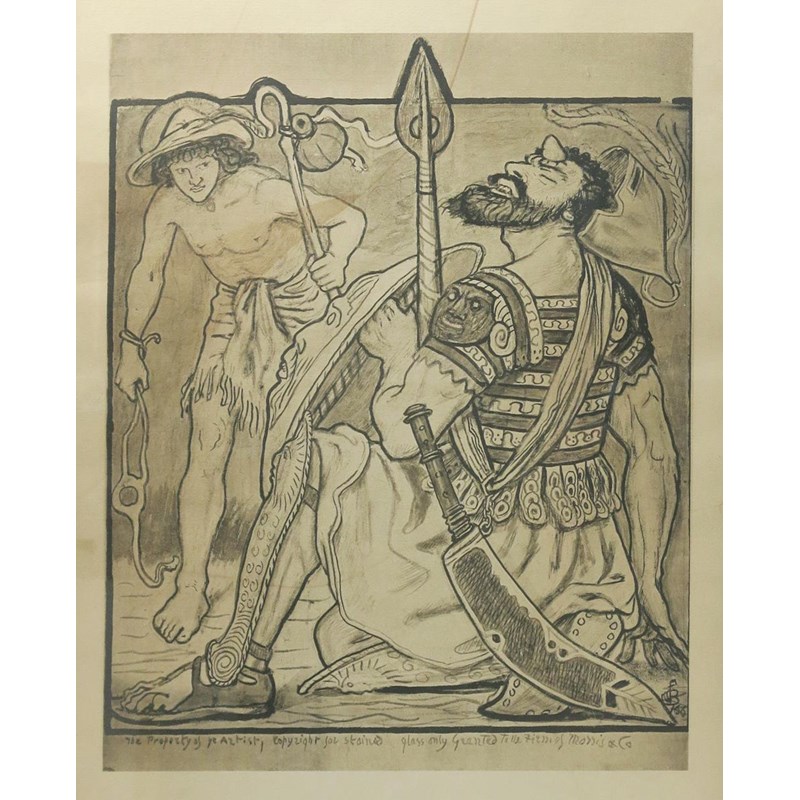 a lithographic print on paper for a stained glass window by Morris & Co, framed