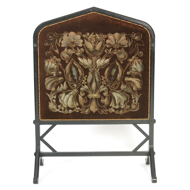 An ebonised wood firescreen in the manner of John Pollard Seddon, arched form with pegged joints, set with embroidered silk  and painted panel of flowers and foliage unsigned, 96cm. high, 68cm. wide