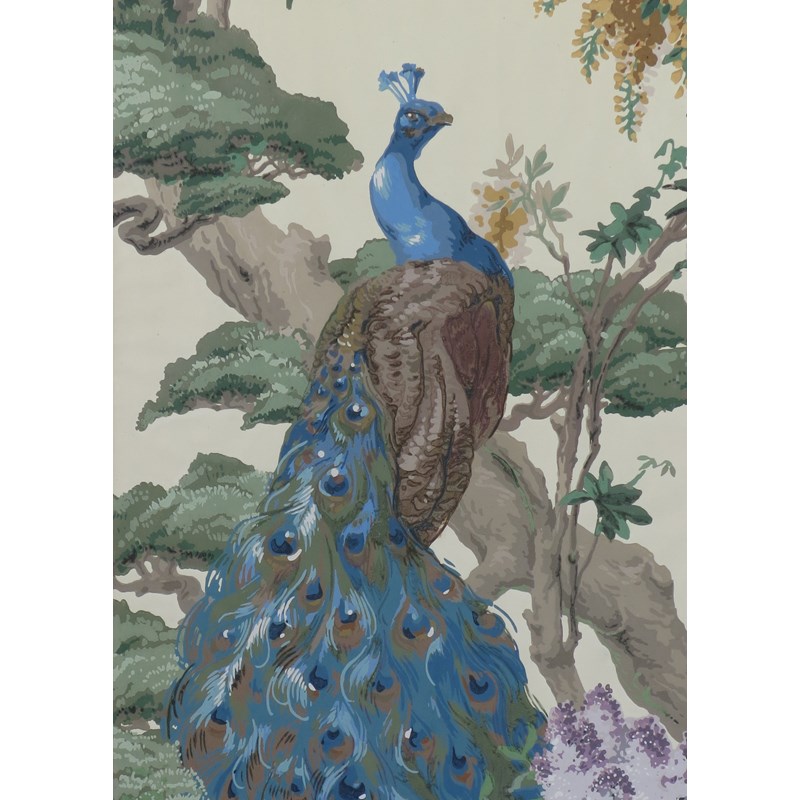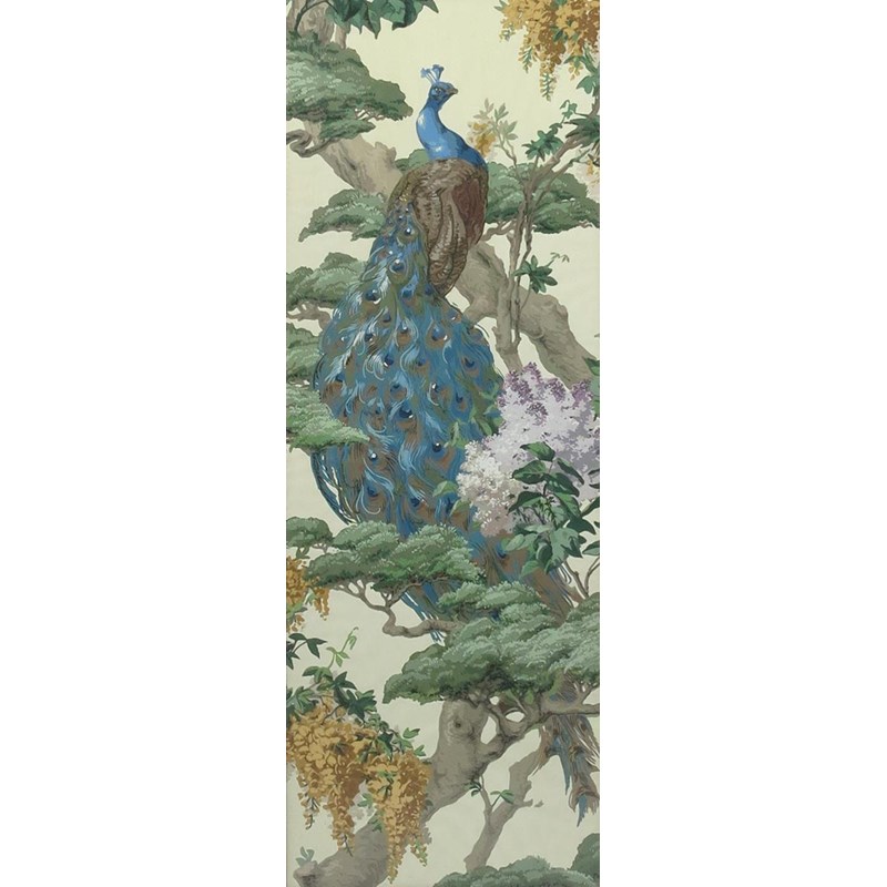 Peacock in a pine tree, with lilac and wisteria blossom
