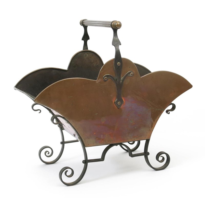 A Benham & Froud copper and wrought iron coal scuttle probably designed by Dr Christopher Dresser, flaring rectangular form on scroll feet and central bar carry handle, stamped mark to base, 50cm. wide.