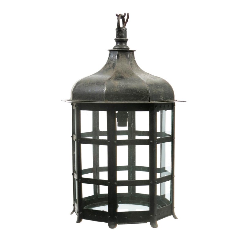 A large Cotswold School patinated iron hall lantern, octagonal section with tapering dome top, with clear glass panels, unsigned, 42cm. high