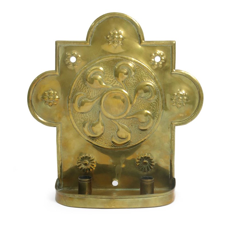 A brass wall sconce probably Keswick School of Industrial Arts, shaped rectangular back stamped in low relief with a central foliate roundel, inside flower head mon, with two candle sconce tray unsigned 31cm. high