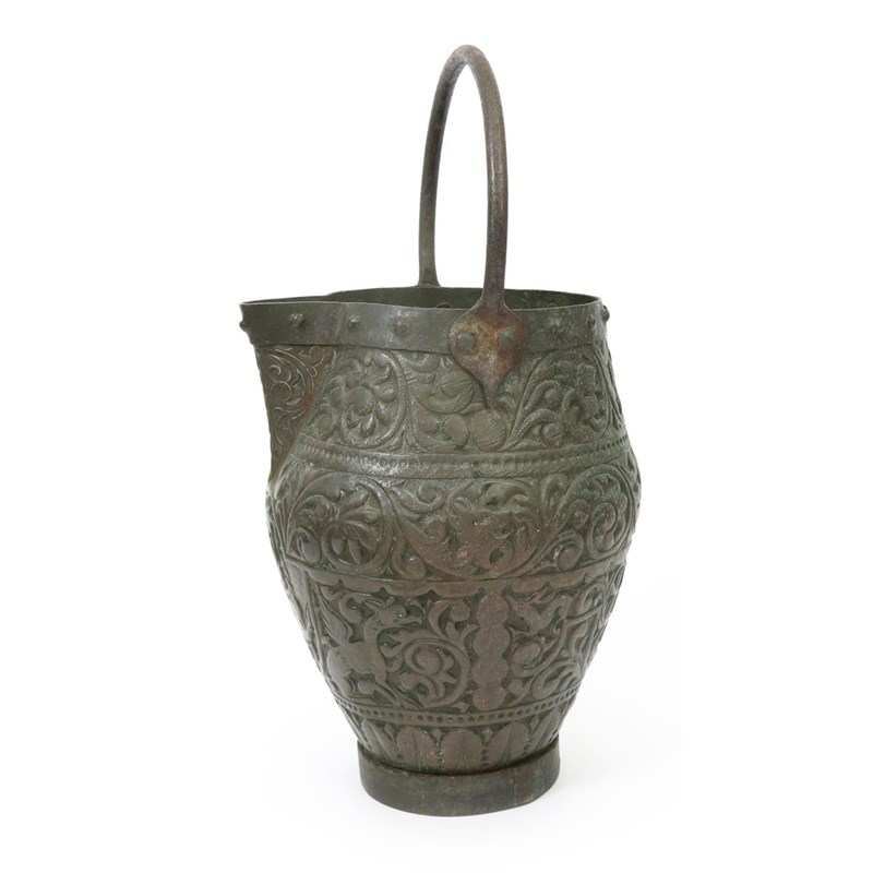 A large copper jug probably Home Arts and Industry, bellied form hammered with bands of mythical beast and scrolling foliage, with heraldic lion, riveted iron handle, unsigned, 43cm. high