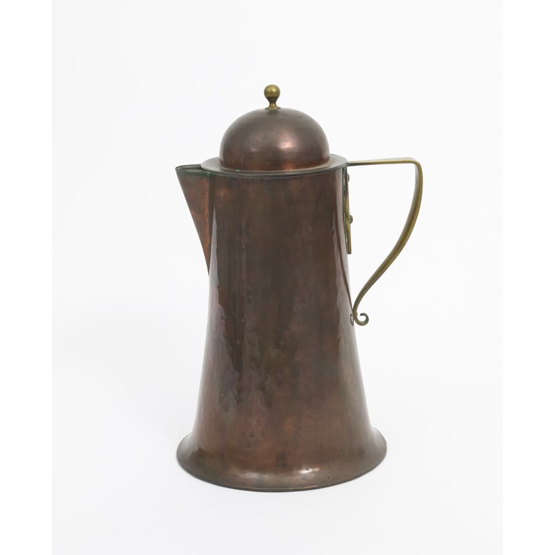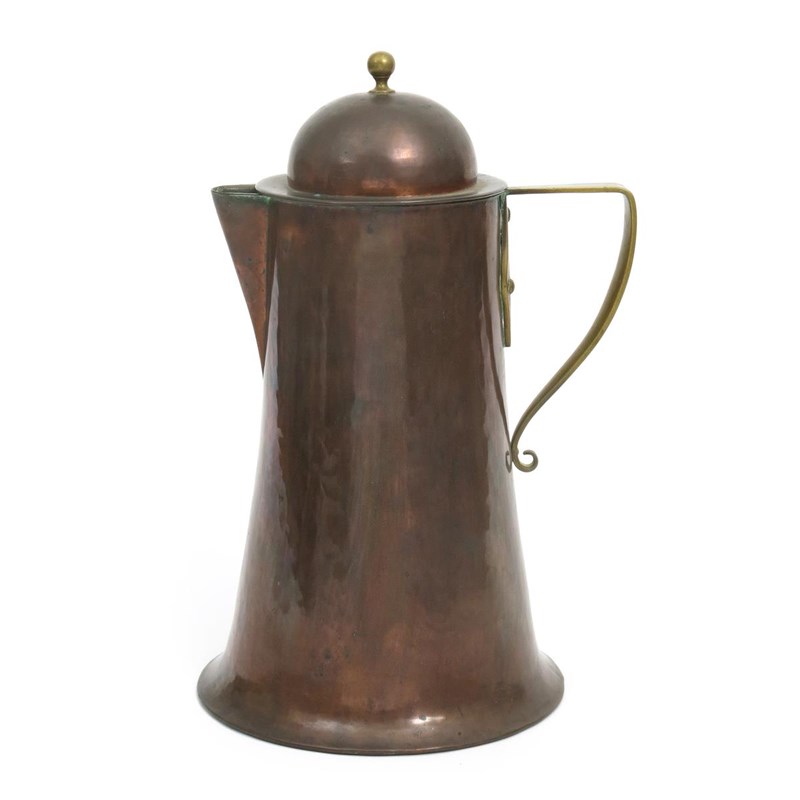 A Birmingham Guild of Handicrafts copper jug and cover designed by Arthur Stansfield Dixon, tapering cylindrical form, with domed cover, with riveted brass handle and ball finial, stamped B.G.H to base 30.5cm. high