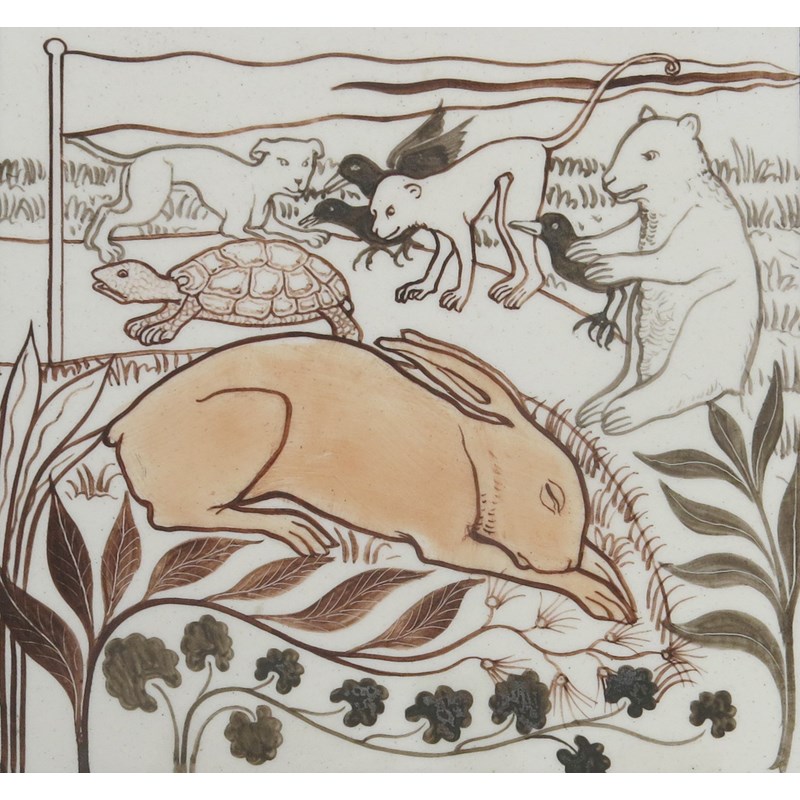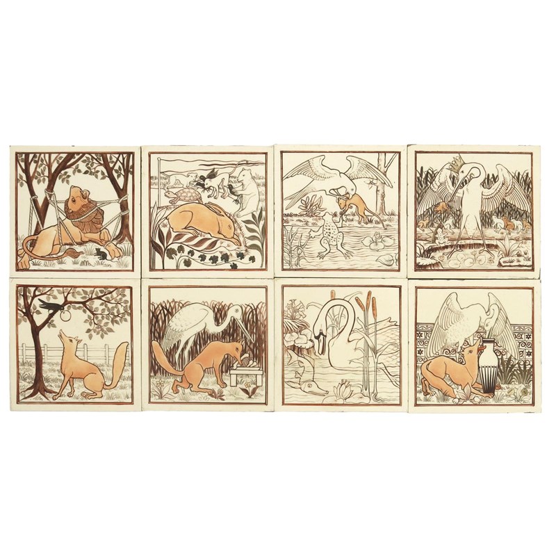 A set of eight Minton Hollins and Co dust pressed Aesops Fables tiles designed by Clemont Heaton, printed with animals in terracotta, brown and green on a cream ground, inside plain border, cast marks, 15.5cm. square (8)
